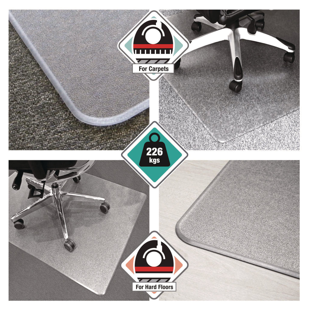Extra heavy-duty polycarbonate chair mats designed for users up to 500 lbs. Perfect for use with Big & Tall/24-hour chairs. The ultimate in quality and durability in floor protection and ergonomics. These high clarity chairmats are made from Floortex Original polycarbonate which has double the impact strength of PVC and will not crack, curl, discolor or smell. High gauge ideally suited for use on home or office hard floors or any pile of carpeted flooring. The perfectly flat and hard surface provides easy glide movement of caster-based chairs which can reduce leg fatigue and lower back strain. Megamat is free from Phthalates, PVC and toxic chemicals. An ideal choice for people with allergies. Manufacturing with 50% of our manufacturing site's energy coming from on-site and external renewable sources. 100% recyclable. Our polycarbonate mats are delivered flat for immediate use.