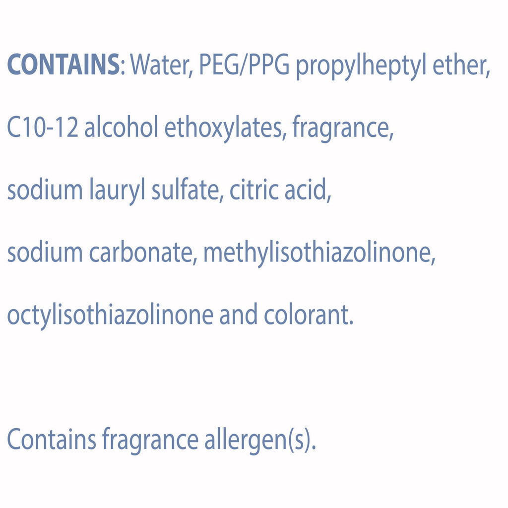| Chemical Compound | Water; PEG/PPG Propylheptyl Ether or C10-12 Alcohol Ethoxylates; Fragrance; Sodium Lauryl Sulfate; Sodium Carbonate; Citric Acid; Methylisothiazolinone; Octylisothiazolinone; Colorant |