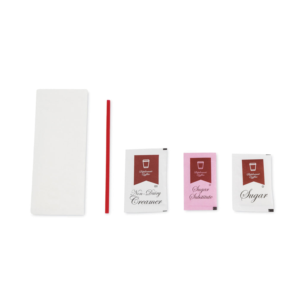 This simple, economical hot beverage condiment kit is perfect for coffee service. Whether in the office or your hotel room, this kit has everything needed to enjoy your favorite beverage. This kit includes one sugar packet, one sugar substitute, one creamer, one plastic stirrer and one napkin.