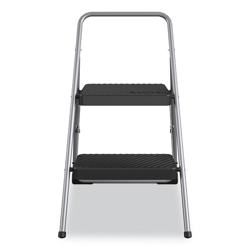 - Steel step stool features strong metal steps with ribbed, slip-resistant treads.