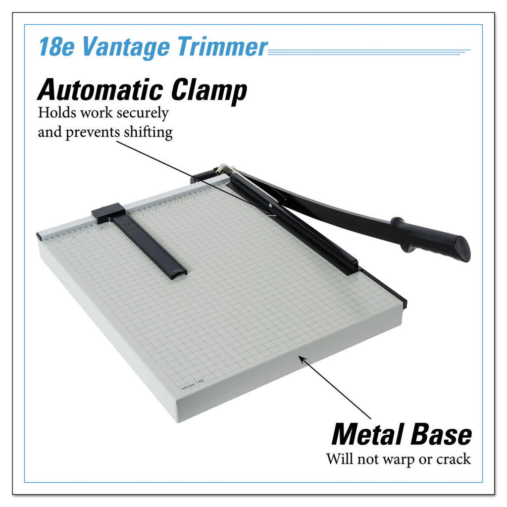 Designed to hold up to rigorous activity, day in and day out. The machine-ground, lever-style blade is sharp and accurate enough that it can remove even the tiniest sliver of paper from your work. For safety, the spring action handle prevents the blade from falling down unexpectedly. Lightweight and marked with guides, Vantage® trimmers offer safety and convenience, while giving you the accuracy you require.