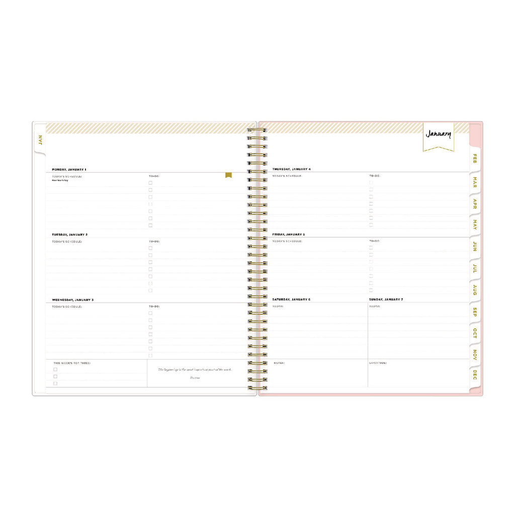 - Weekly view per two-page spread contains space for daily schedule, to-do list, notes and gratitude sections, and an inspirational quote.