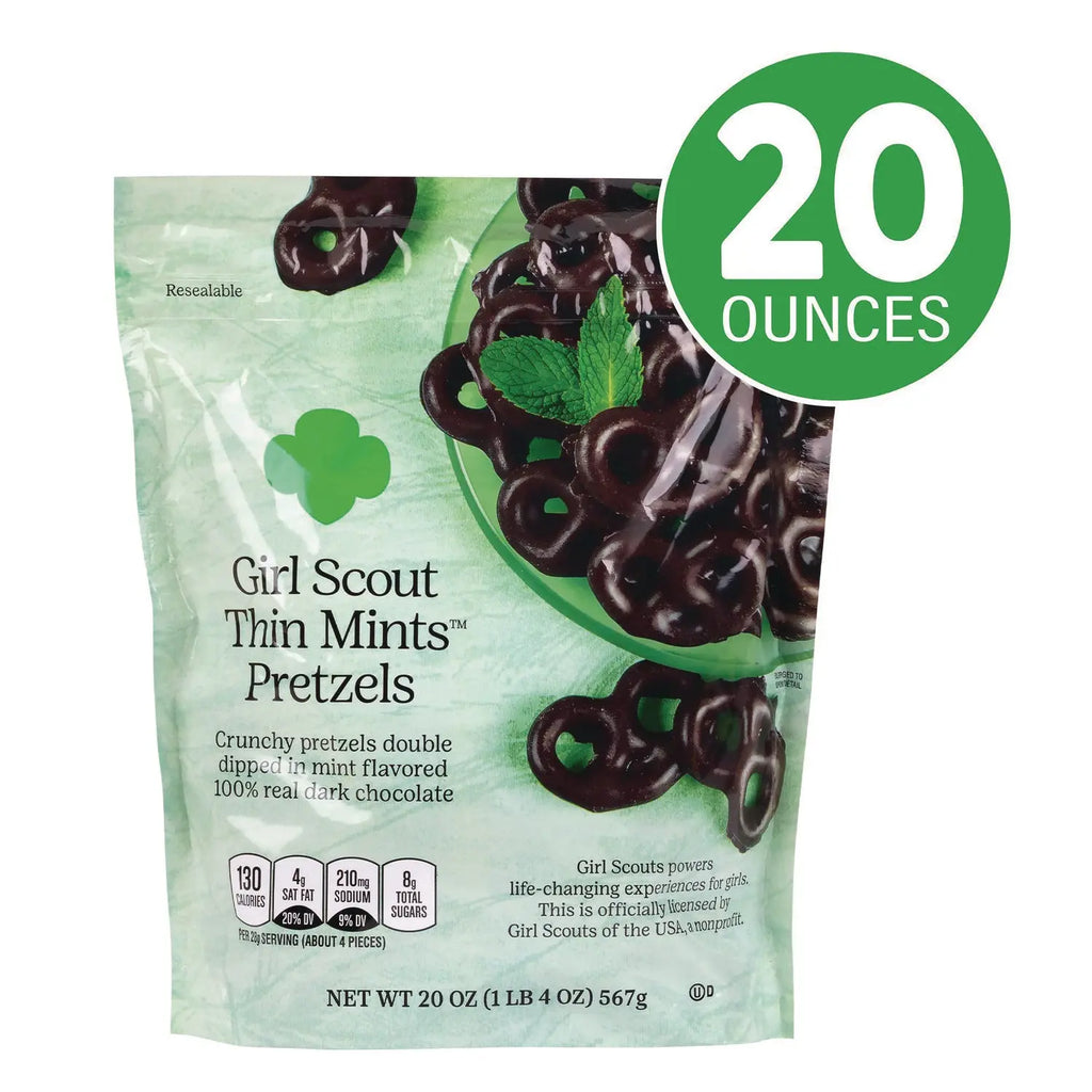 Try these delectable Girl Scouts Thin Mints Pretzels, a sweet snack with minty flavor. Pretzels are double-dipped, coated in rich mint flavored 100% real dark chocolate. The standup resealable bag makes it easy to share and snack.