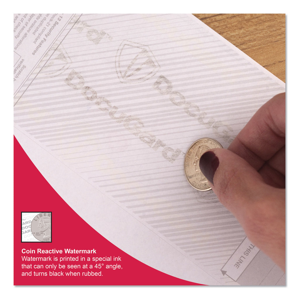Incorporates security features recommended by the National Check Fraud Center. Compatible with most money management software programs. Security features include: Check-21 compliancy, "VOID" pantograph on the front and back, erasure-resistant background, security warning, anti-splice backer, security features listing, watermark, check verification number, patterned background and microtext print.