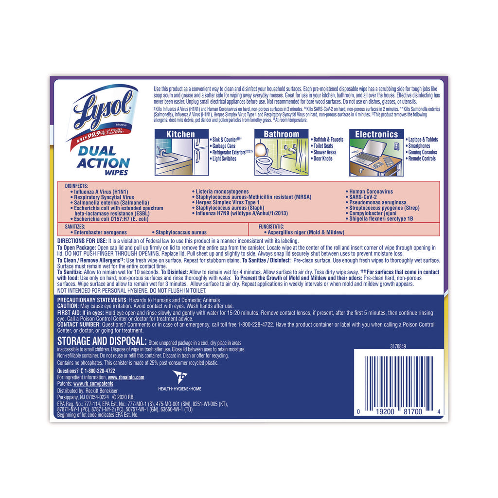 - Kills 99.9% of viruses and bacteria, including cold and flu viruses, Salmonella, E. Coli, MRSA, RSV, Staph, and Strep, when used as directed on hard, non-porous surfaces.