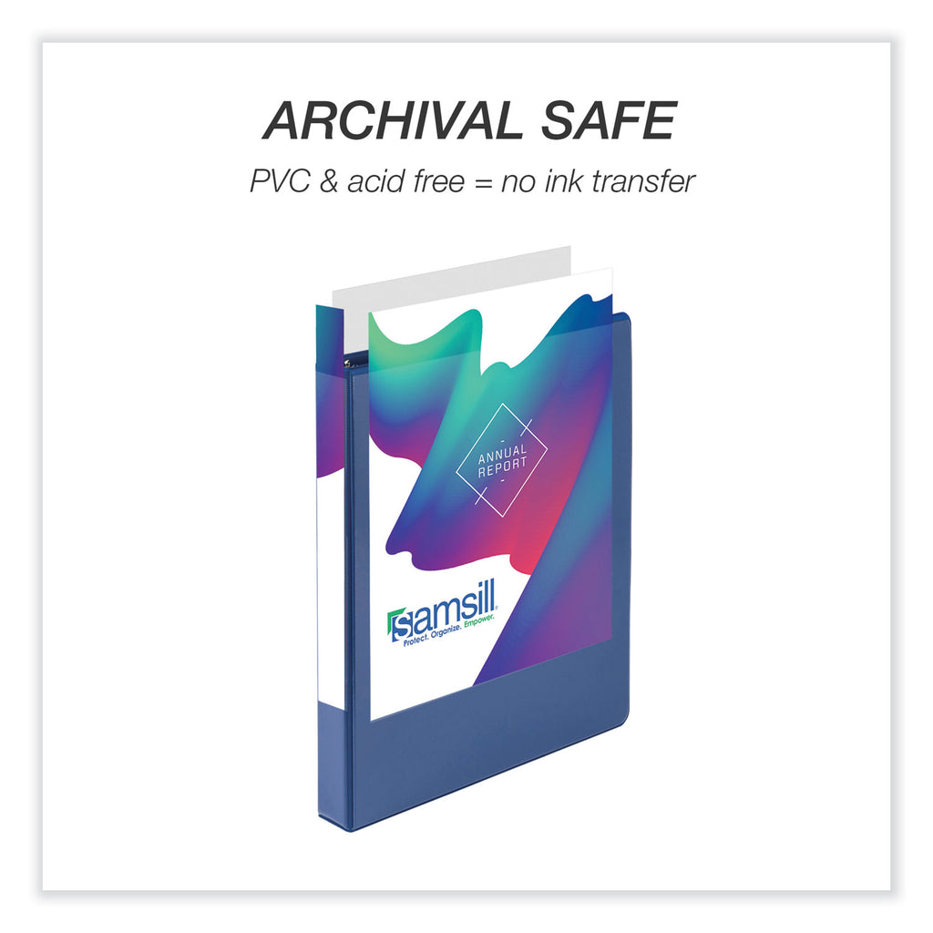 These three-ring binders make indispensable home, office, and school supplies offering the economical paper storage and organizational value you've been searching for. This important document binder features a clear overlay along the front, back, and spine, allowing you to customize your presentations, projects, and more. Non-stick materials are used to make this product, which prevents ink transfer or lifting copy when materials are inserted into the cover or placed inside. Three binder rings with double boosters hold 8.5 x 11 letter-sized sheets with ease. The rings are mounted on the back lid, allowing pages to lay flat while preventing wear and tear on documents. Two clear interior pockets provide additional storage with enough space for notes, photos, business cards, or full-size pages.