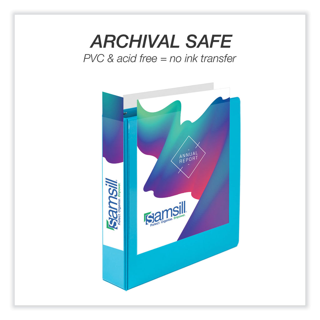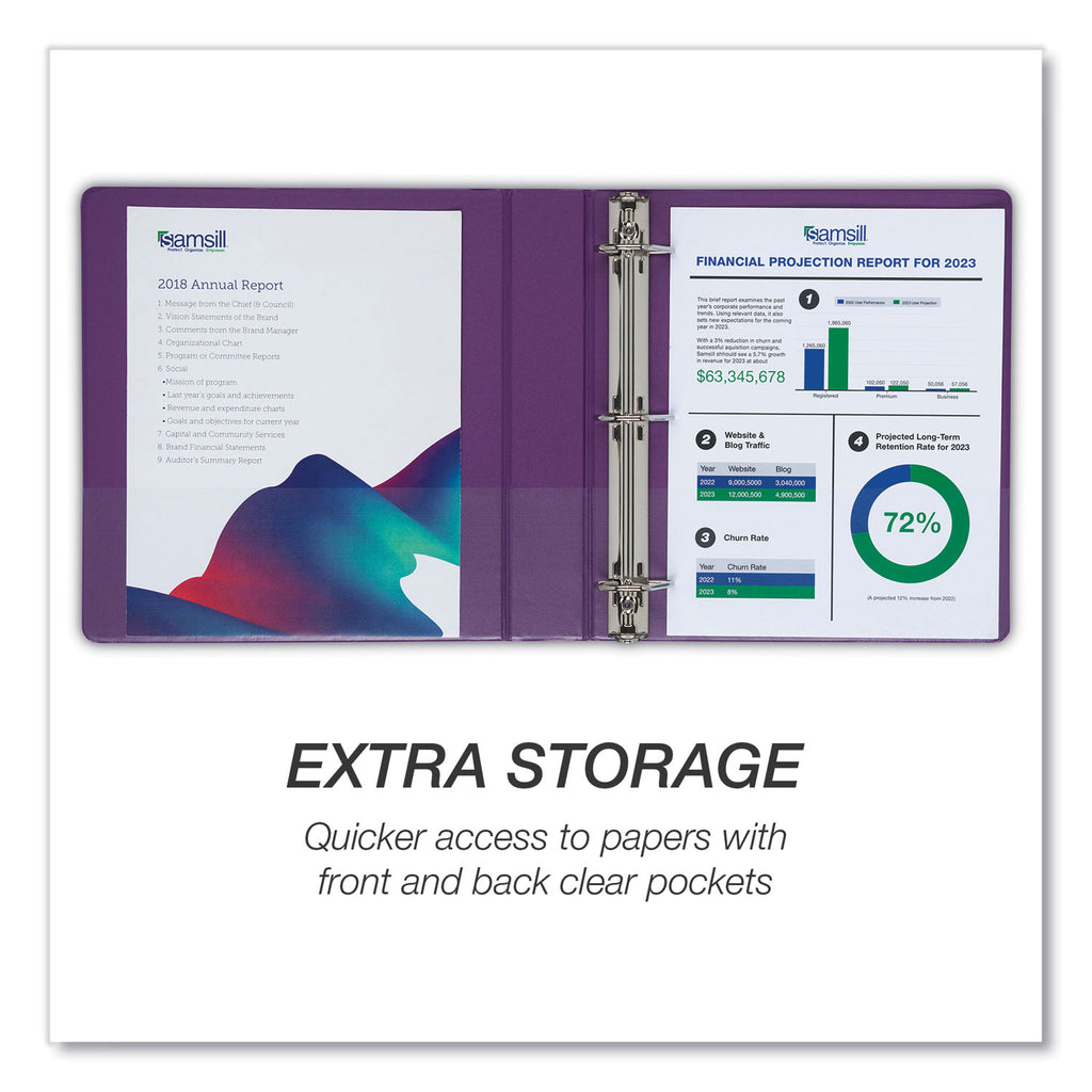 These three-ring binders make indispensable home, office, and school supplies offering the economical paper storage and organizational value you've been searching for. This important document binder features a clear overlay along the front, back, and spine, allowing you to customize your presentations, projects, and more. Non-stick materials are used to make this product, which prevents ink transfer or lifting copy when materials are inserted into the cover or placed inside. Three binder rings with double boosters hold 8.5 x 11 letter-sized sheets with ease. The rings are mounted on the back lid, allowing pages to lay flat while preventing wear and tear on documents. Two clear interior pockets provide additional storage with enough space for notes, photos, business cards, or full-size pages.
