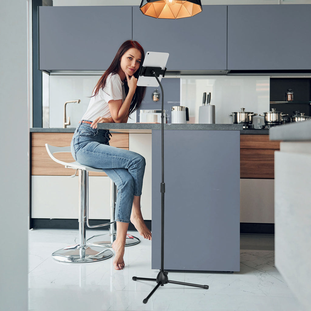 The Durable® TWIST Floor Stand is the ultimate solution for those looking for a convenient tripod that works with tablets, iPhones, Androids and iPads ranging from 4.7" to 13" and weighing up to 1.8 lbs. The telescopic tripod can extend up to 5 ft 5" tall and has 360° rotation so you can adjust the angle depending on your preferences. Designed for seamless transporting, the tripod is 27" when folded and conveniently comes with an included storage bag so you can bring it with you wherever you go. Perfect for recording your own content, Get Ready with Me, live broadcasting, watching videos, following instructions when cooking and so much more. Includes a cable management slot so you can charge your device while in the stand for total flexibility. The non-slip pads keep your device protected and stable while in use.