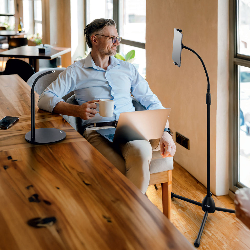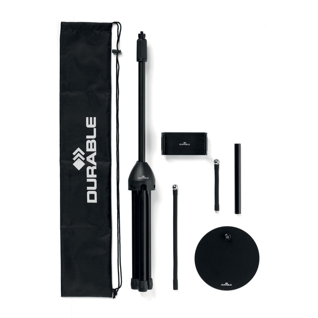 Get the best of both worlds with the Durable® TWIST COMBI Table and Floor Stand with 360° rotation for Tablets, iPads, iPhones and Androids. Featuring a convenient desk stand and a telescopic tripod, users can choose between a table or floor angle depending on their needs. Compatible with all tablets, iPads and iPhones ranging from 4.7" to 13" and weighing up to 1.8 lbs. The tripod can extend up to 5 ft 5" tall and is 27" when folded, conveniently fitting in the included storage bag for lightweight transporting. Perfect for recording your own content, Get Ready with Me, live broadcasting, watching videos, following instructions when cooking and so much more. Includes cable management slots on both the table and floor stand so you can charge your devices for total flexibility. The non-slip pads on both stands also keep your device protected and stable while in use.
