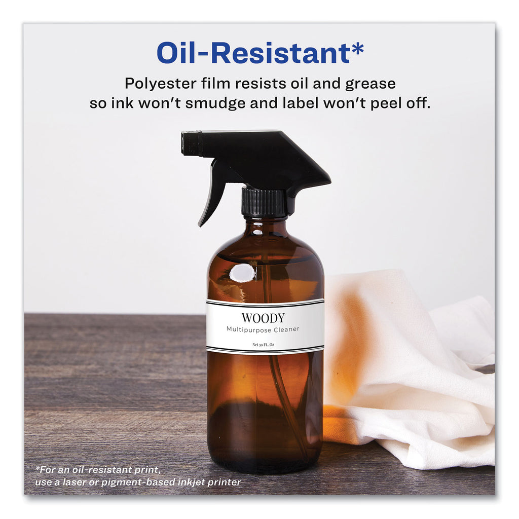 Flexible label conforms to curved surfaces. Perfect for water bottles, containers and more. Water- and scuff-resistant. Permanent adhesive sticks and stays. Labels with Sure Feed® technology are designed for a reliable feed through your printer. 8.5" x 11" sheets for laser and inkjet printers.