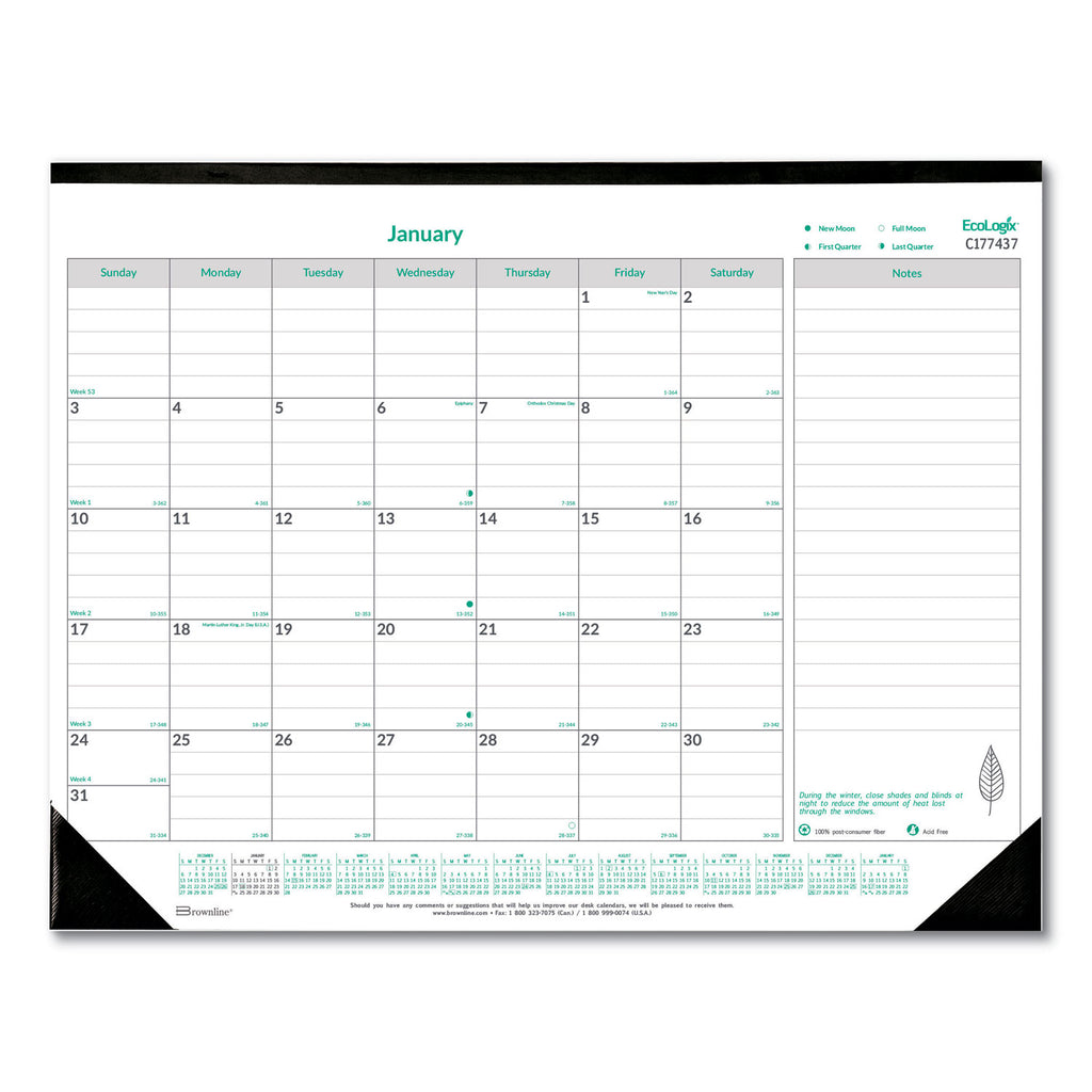 Designed with the future in mind with an eco-friendly tip each month. Ruled daily blocks, note space and a full-year reference calendar for future planning. Perforated sheets for easy removal. 100% post-consumer recycled paper.