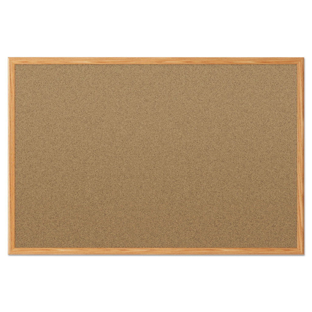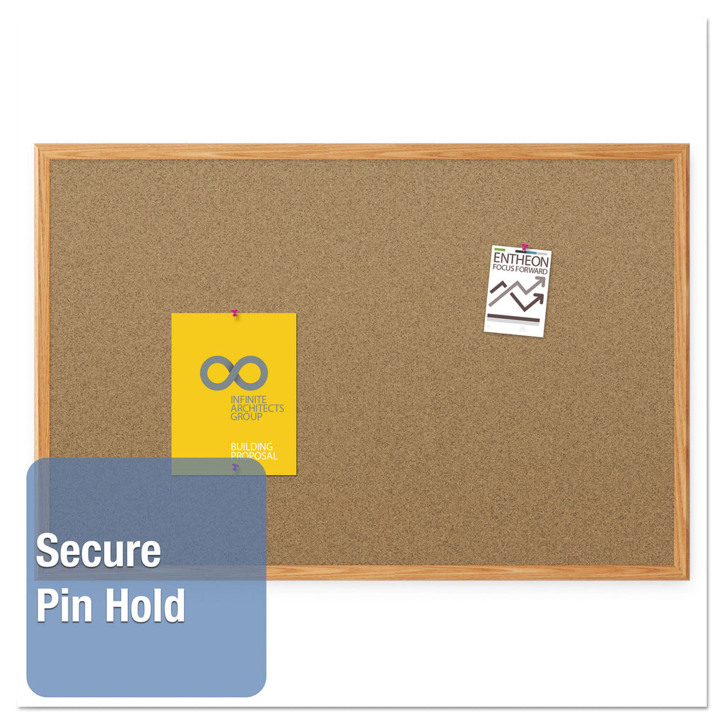 The self-healing cork surface of this bulletin board is ideal for displaying documents, photos and more. Size is great for personal use and oak finish frame fits any space. SureLock mounting system is included for quick and easy hanging. Push pins not included.