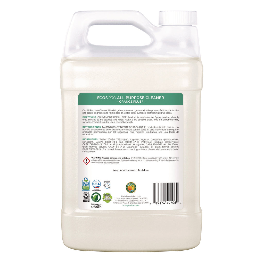 ECOS PRO Orange Plus is an all-purpose cleaner and degreaser that effectively lifts dirt, grime, scum, grease, and adhesive residue with the power of citrus plants. Use it to clean and fight odors on water-safe surfaces. This formula is made using sustainable, plant-powered ingredients. Made without dyes; gray water and septic safe. Features a refreshing citrus scent. Not tested on animals. Manufactured in a facility that is LEED Zero Carbon, LEED Zero Waste, and LEED Zero Energy Certified.