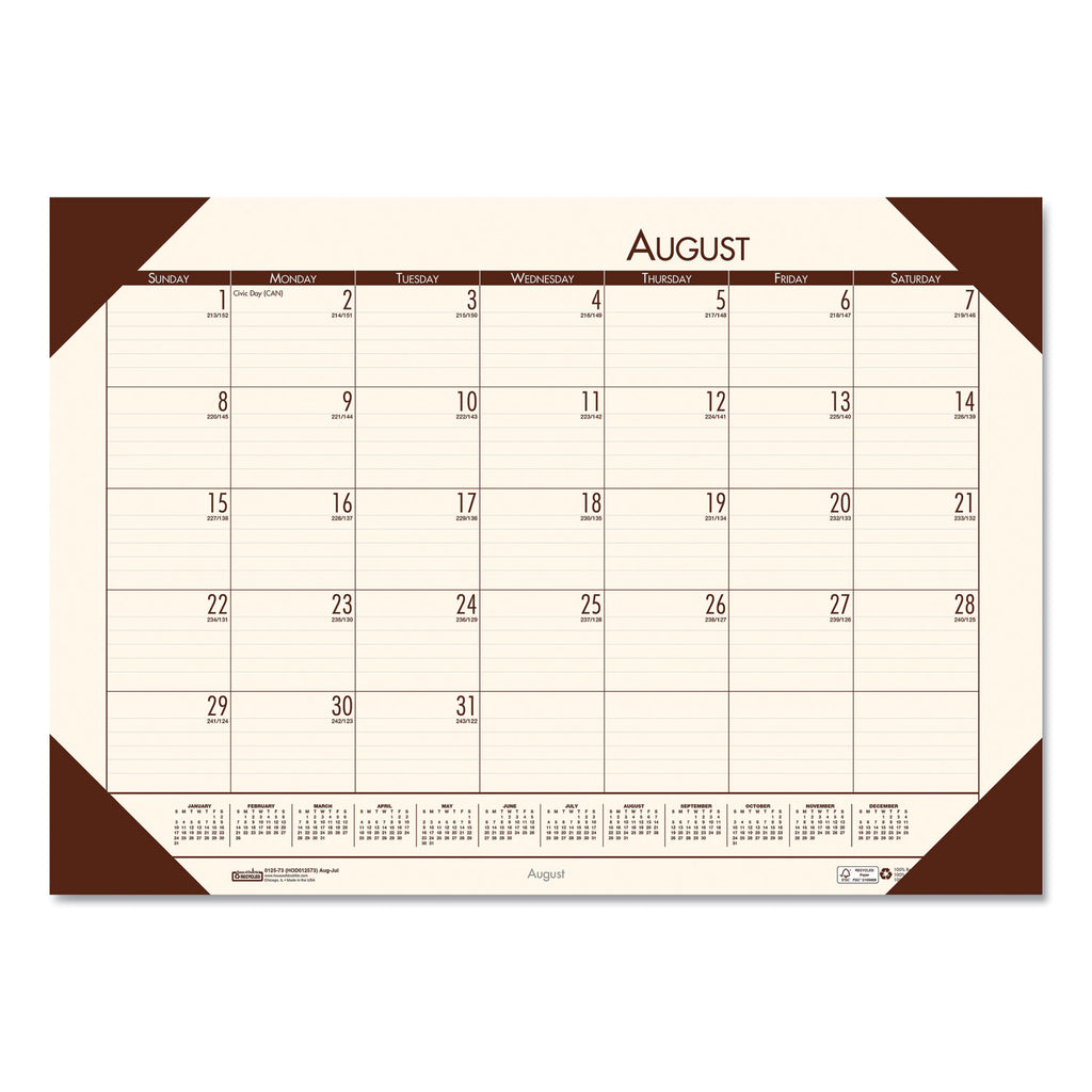 Unique size is perfect for smaller workspaces. Strong, reinforced color-matched corners complement the pad's paper color. Includes a full-year reference calendar and lightly ruled daily blocks. Made entirely of recycled materials.