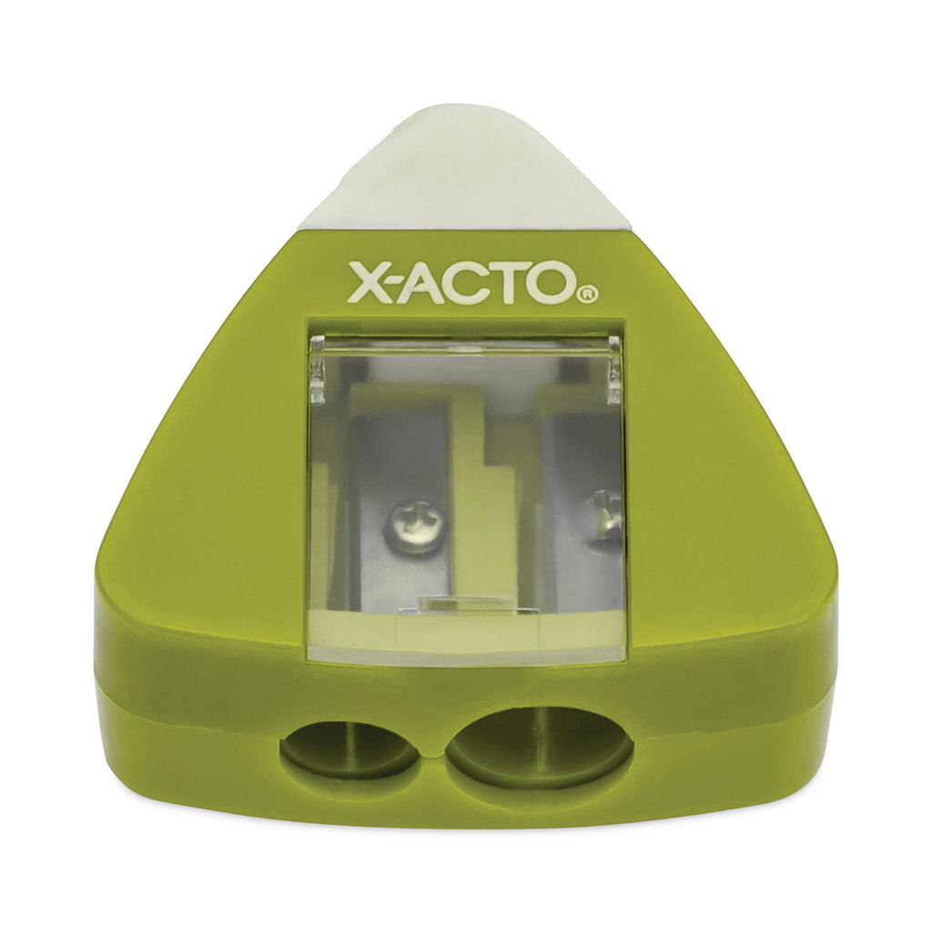 - Triangle manual sharpener with built-in eraser is portable and lightweight to carry in backpacks or tuck into desk drawers.