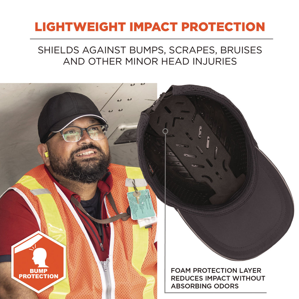 This Lightweight Baseball Hat features the Skullerz 8943F(x) hinged impact-resistant bump cap insert for flexible, breathable protection against bumps, scrapes, bruises and other minor head injuries. This lightweight polyester hat is not stiff or bulky, and also features breathable laser-perforated side and back panels for maximum airflow. Designed with a buckle closure and adjustable rear sizing strap for a custom fit. Reflective accents and piping help ensure workers are seen in low-light conditions. Not bulky like a hard hat, bump caps are typically worn in spaces where worker-generated impact head protection is needed, like low ceilings, beams, low pipes and other bump hazards. They are ideal for mechanics and airline baggage handlers, as well as workers in factories, in-home services and other industries that do not require safety hard hat protection.