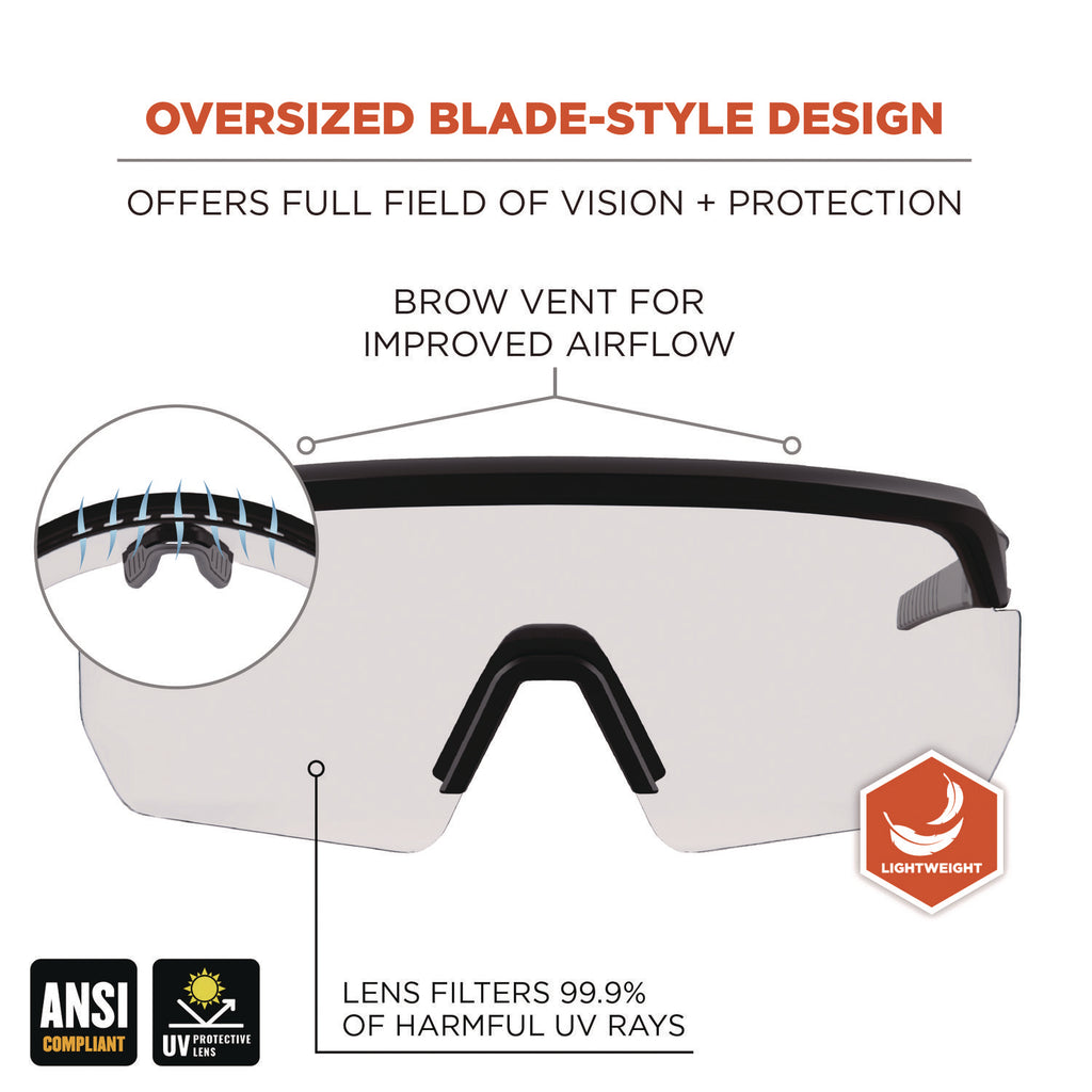 - Oversized blade-style design provides superior eye protection and maximizes field of vision.