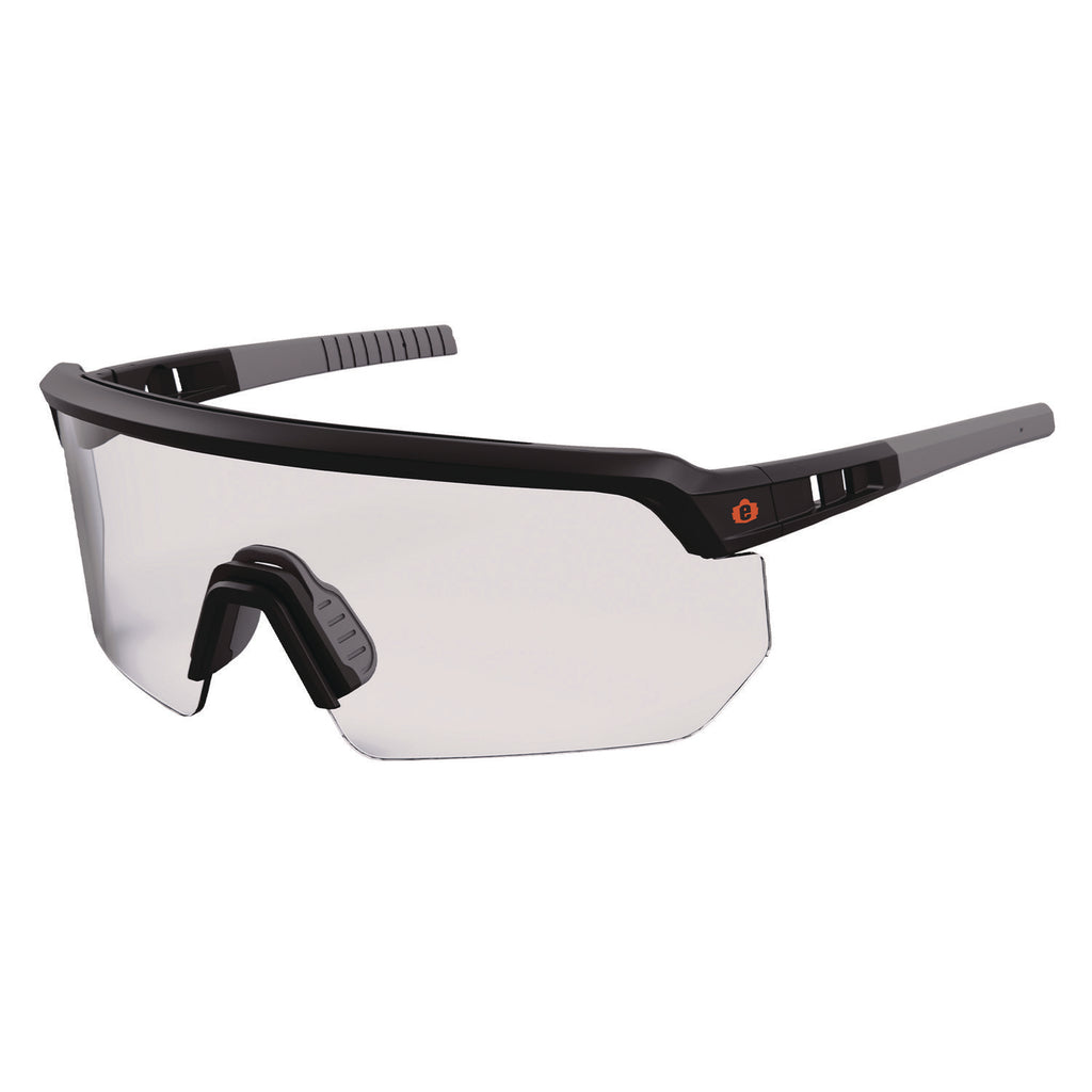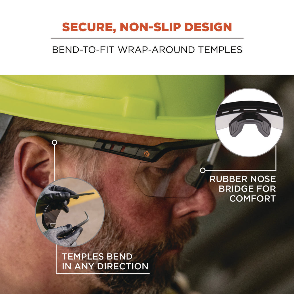 An oversized blade-style design to provides superior eye protection and maximized field of vision. These protective safety glasses feature polycarbonate lenses to protect against impacts and filter 99.9 percent of harmful UVA, UVB and UVC rays. The high-strength frame is built for durability and the rubberized nose bridge and temples offer non-slip security and resist sweat for all-day comfort. To provide a custom fit, the rubber temples can be easily bent and re-bent to accommodate a variety of head shapes and fit preferences.