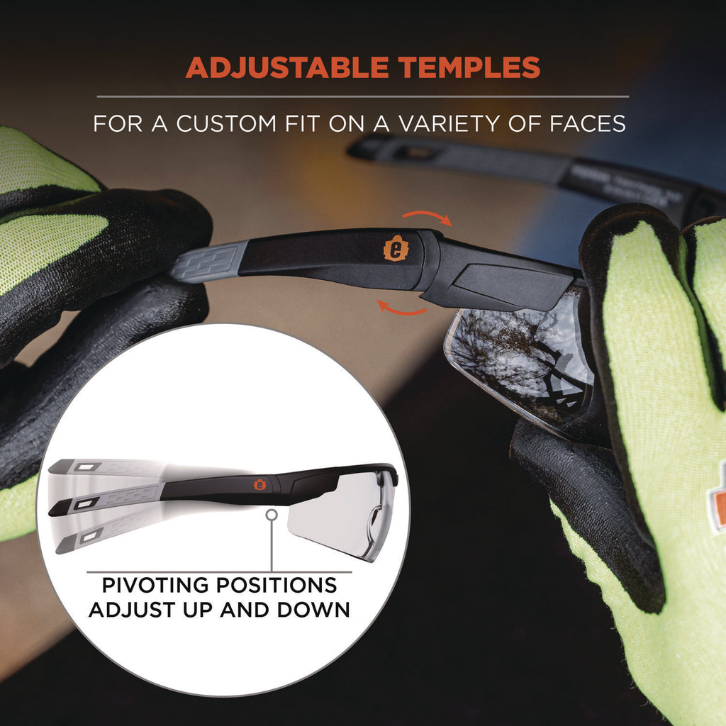 These safety glasses feature adjustable temples that shift up or down and lock into place for a custom fit on a variety of face sizes. They feature polycarbonate lenses to protect against impacts and filter 99.9 percent of harmful UVA, UVB and UVC rays.
