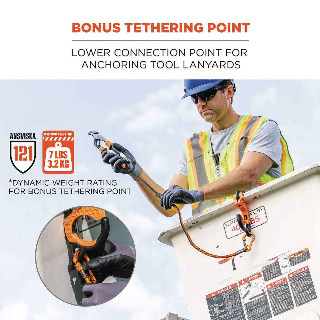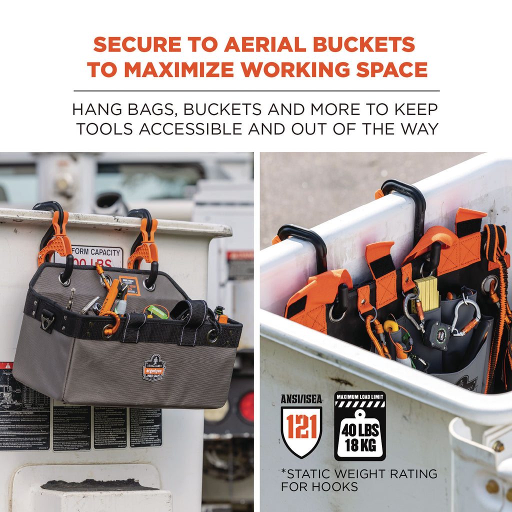 Features a self-locking exterior hook, a non-locking interior hook and an enclosed tethering point to save space and prevent dropped objects when working in cramped buckets. Simply clip to the bucket lip for safe anchoring of tool buckets, bags, aprons, tool lanyards and other equipment. Built for durability in demanding environments.