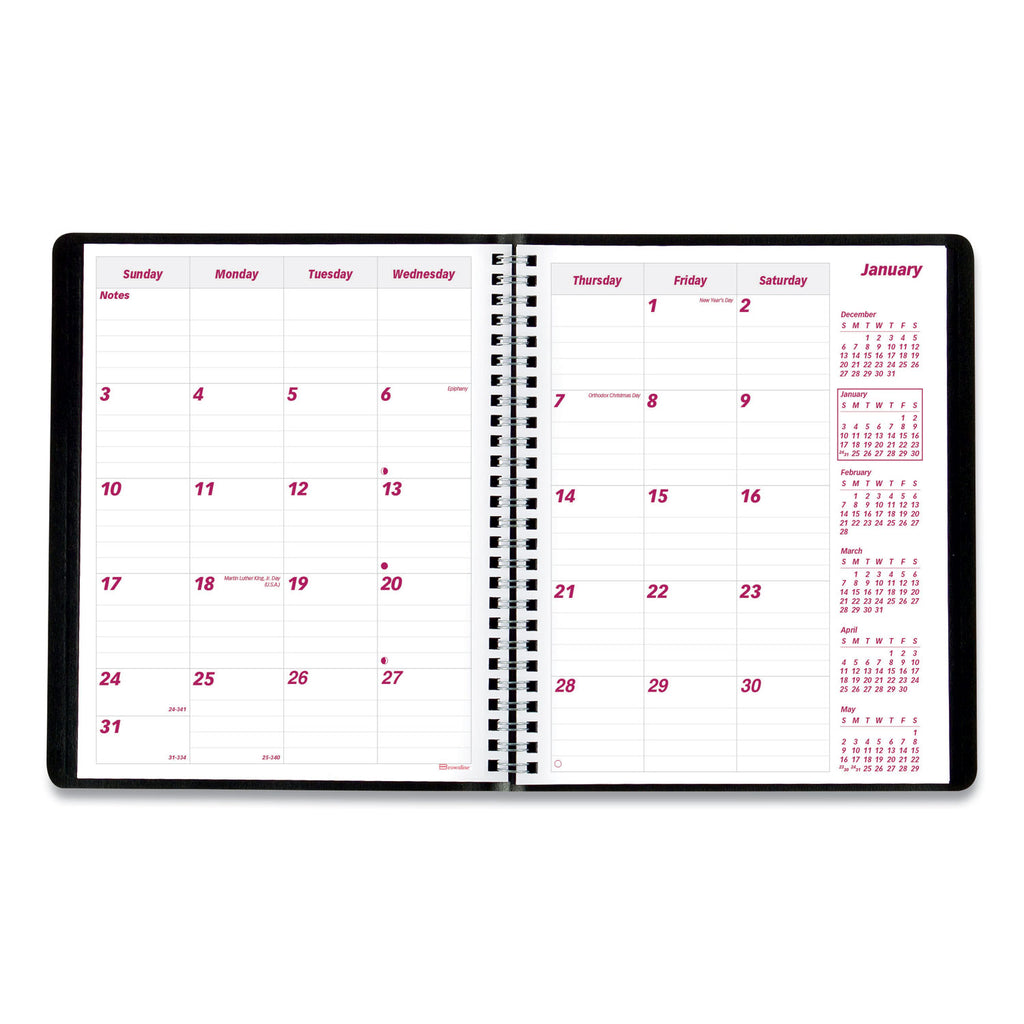 One month on each spread with ruled daily blocks for notes. Six-month calendar reference blocks for help with planning. Includes extra note pages and telephone/address section.