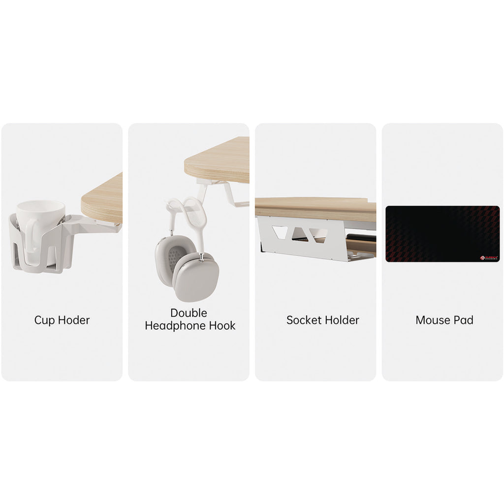 - Includes cup holder, headphone hook, cable management tray, and cloth mouse pad.