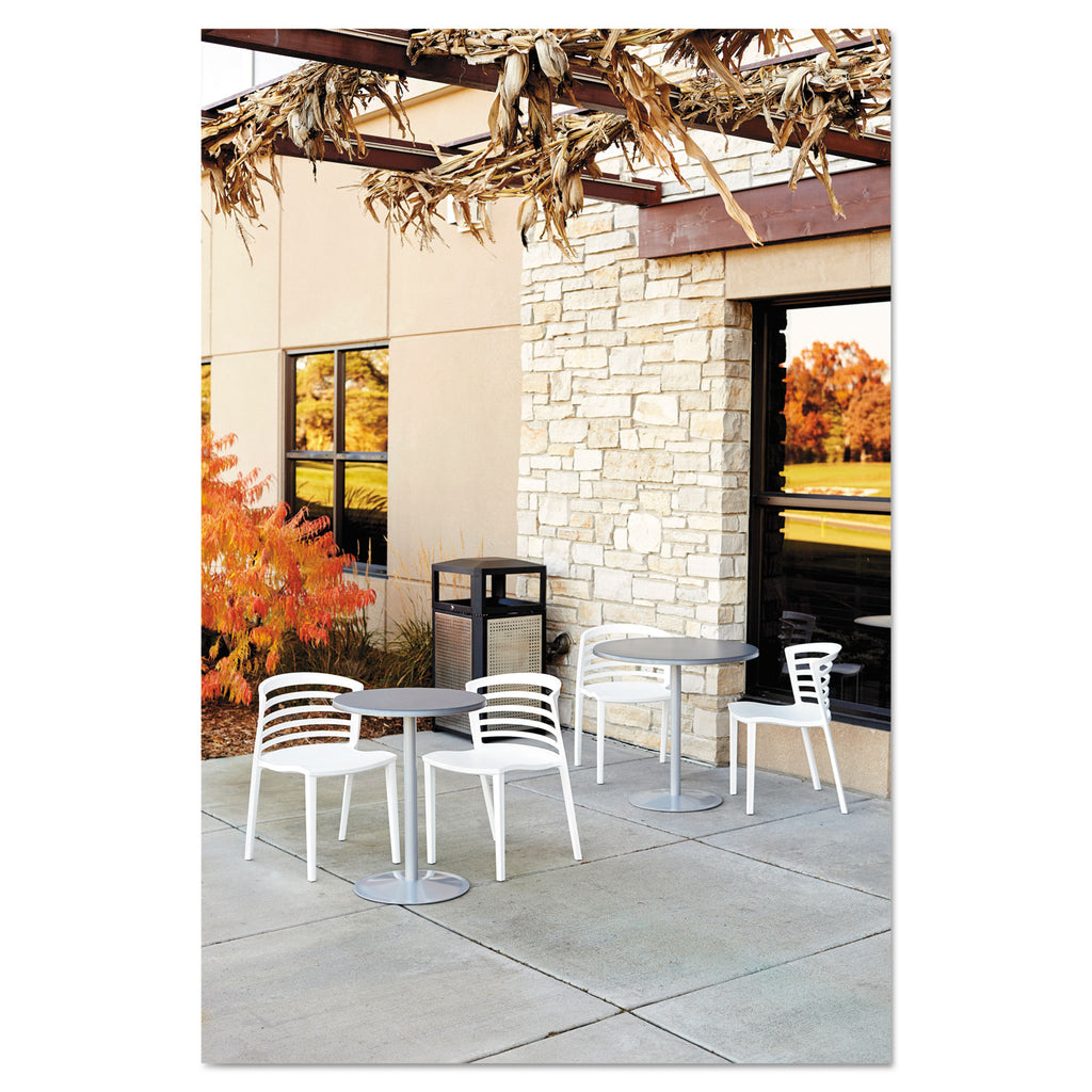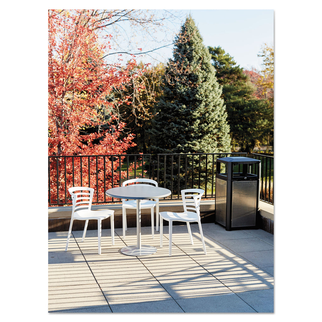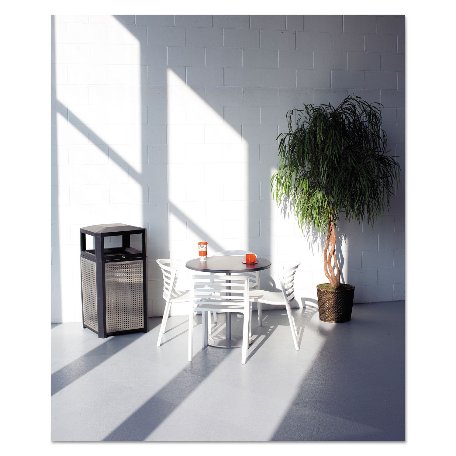 Attractive container helps manage waste and litter, indoors or out. Strong steel frame and decorative, galvanized steel panels are suitable in any first impression area. Four-sided opening makes it easy for pedestrians to drop their waste in passing. No assembly required and includes rigid plastic liner.