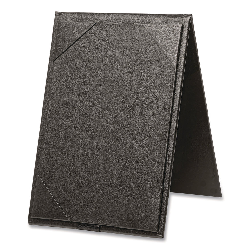 This menu holder is perfect for use in restaurants, cafes, bars and more. Freestanding A-frame design displays menus from front and back. Picture corners allow for easy menu changes. Made from durable polyurethane leather.