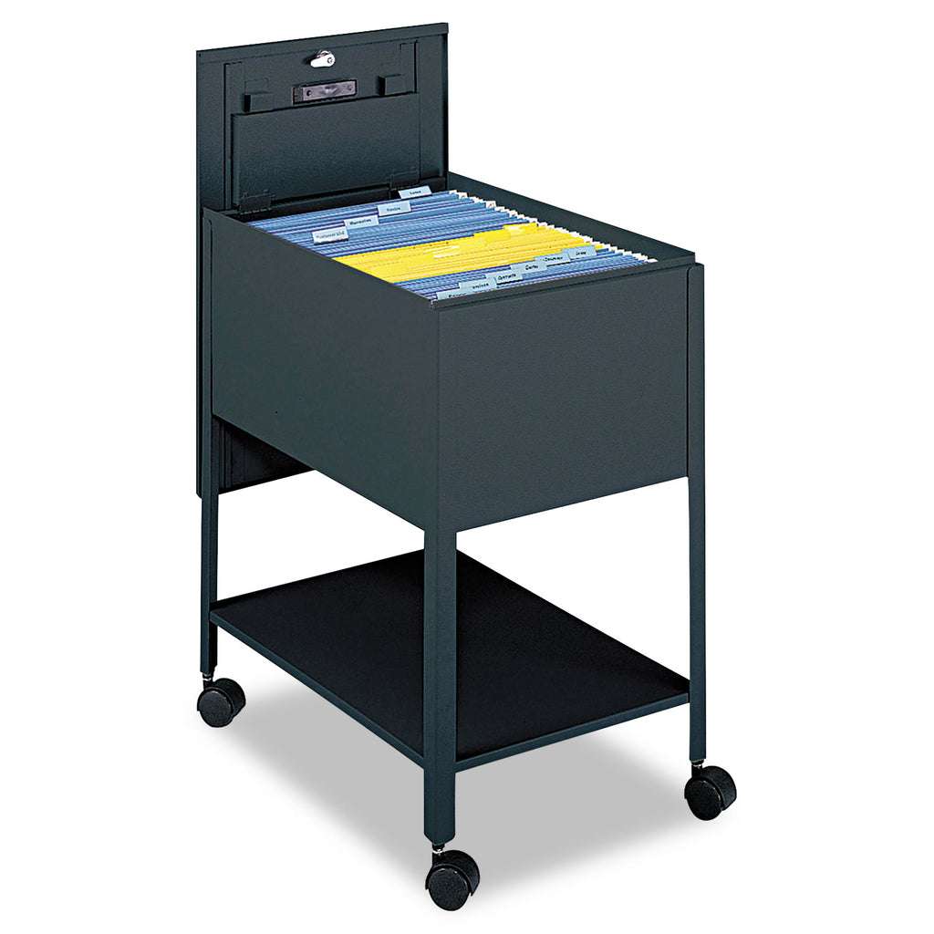 Textured finish. Locking hinged cover keeps dust out while securing files. Handy bottom storage shelf.