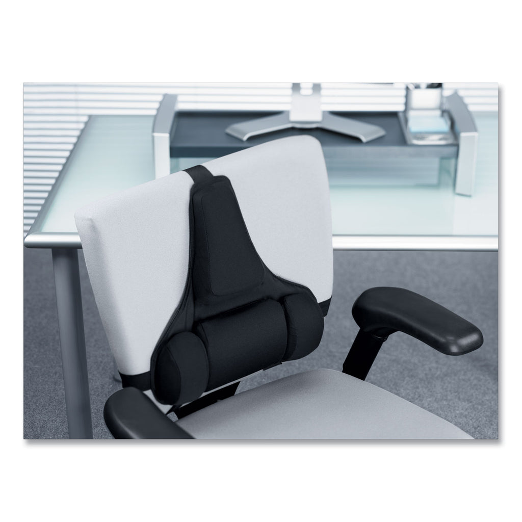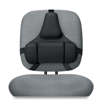 Mid-spinal support with memory foam cushion promotes good posture. Lower lumbar support with three memory foam sections conforms comfortably to natural body curvatures. Microban® antimicrobial protection helps keep product cleaner. Innovative Tri-Tachment™ system eliminates the need for readjustment. Fits most office chairs.