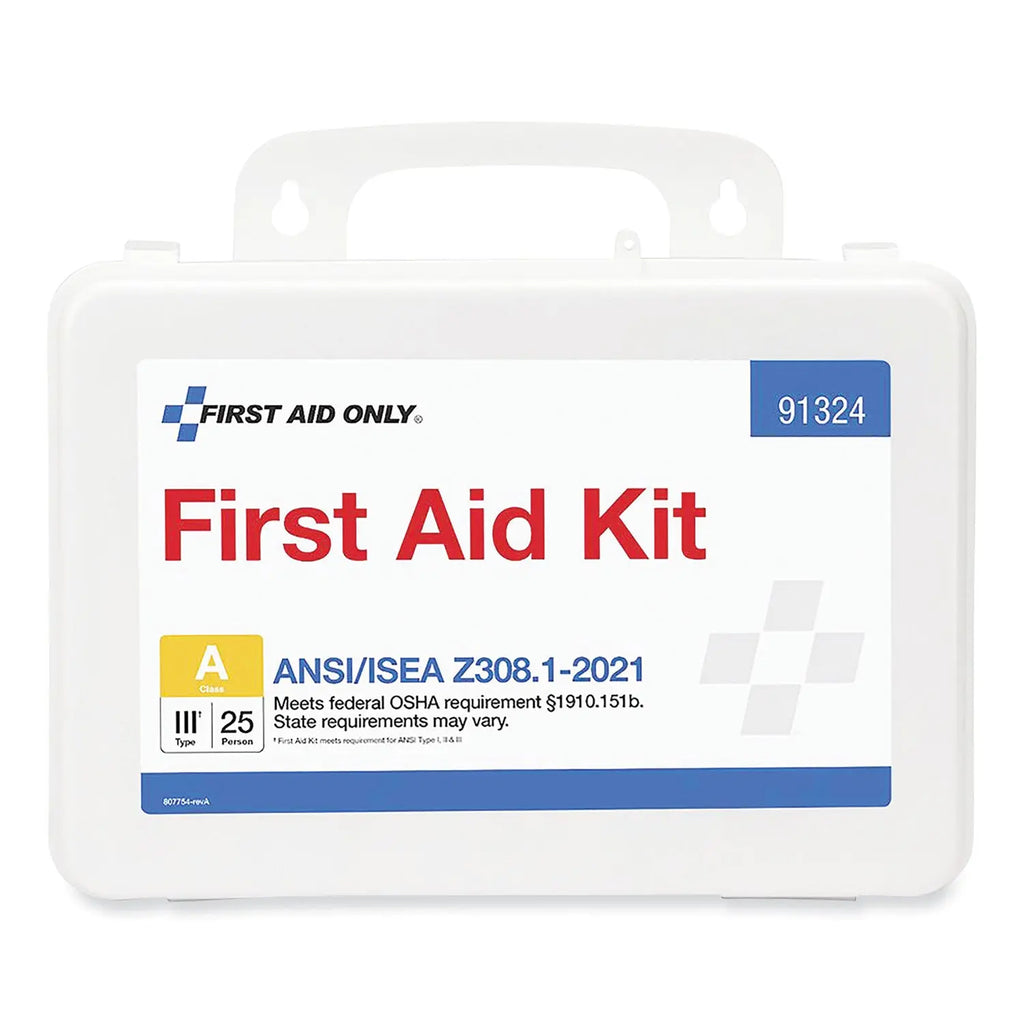 This 94-piece, 25-person bulk first aid kit is designed for use in small offices, vehicles and work sites. The weatherproof plastic case is wall-mountable, yet has a handle for easy carrying.