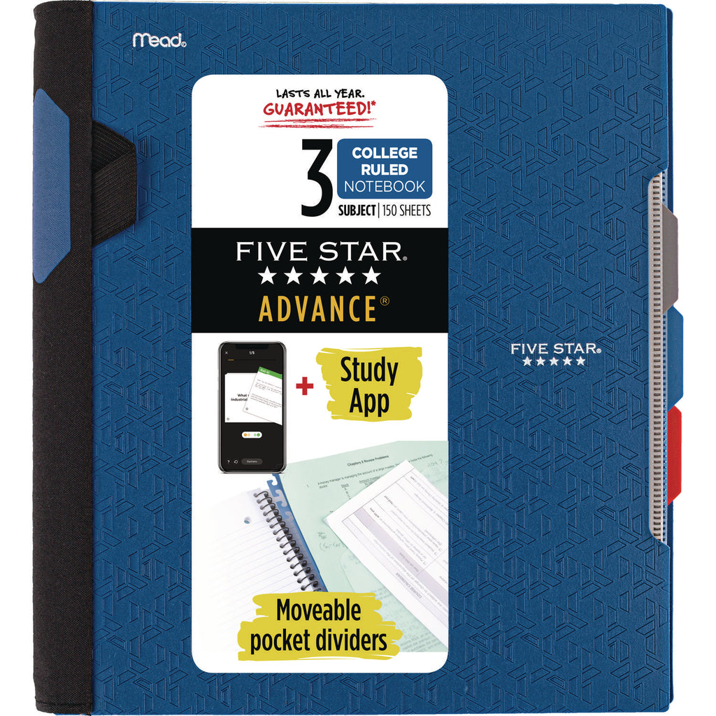 Lasts all year. Guaranteed! Scan, study and organize your notes with the Five Star App. Create instant flashcards and sync your notes to Google Drive to access them anywhere from any device. Rearrange the movable plastic dividers anywhere in your notebook to organize notes. Dividers with expanding pockets hold 8.5" x 11" handouts. Visible tabs from front cover make it easy to flip to any section. Spiral Guard covers the wire to help prevent snags on clothes and backpacks. Label your notebook on the writable spine, and keep your favorite pen or pencil handy in the pen loop. Guarantee is valid for one year from purchase date. Does not cover misuse.