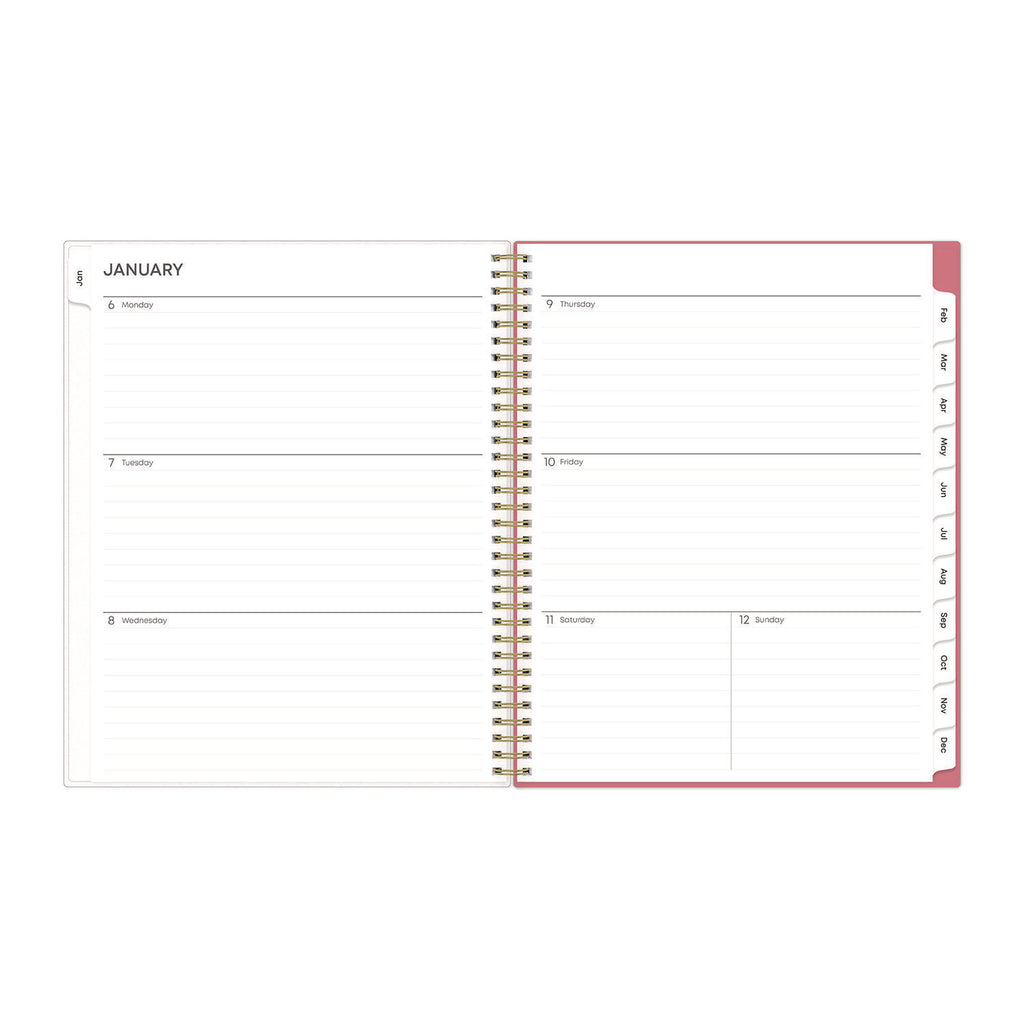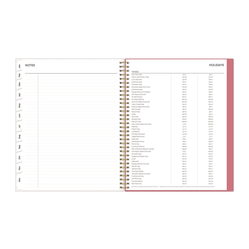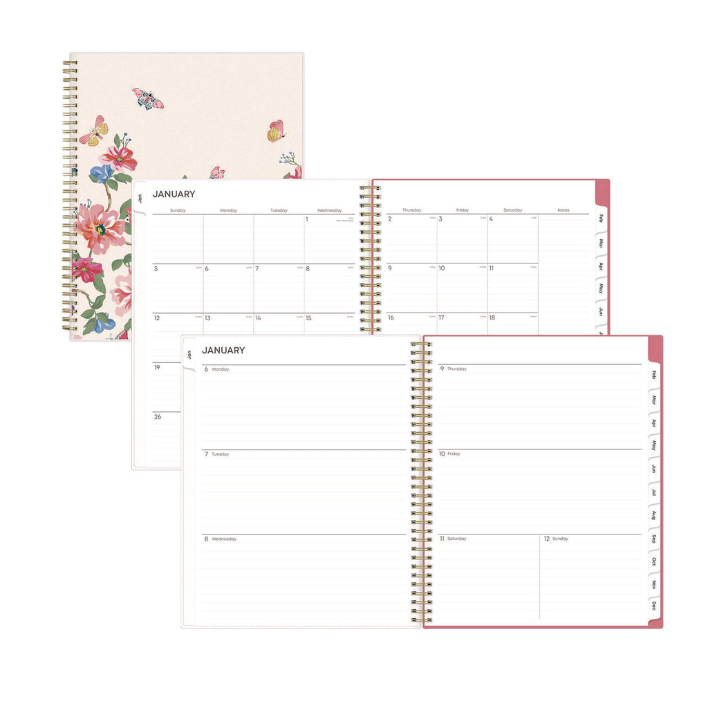 Frame your plans with elegance. Butterflies flit across this beautiful Fly By cover and bring peace to your busy schedule with its graceful pink and blue florals on a cream background. Two-page-per-week spread features lined daily blocks. Monthly view per two-page spread includes a Notes section for important projects. Monthly tabs are coated for durability. Durable, frosted flexible front cover. Twin-wire binding offers easy page turning. Includes pages for Yearly Goals, Contacts, Reference Calendars, and extra Notes pages. Thick, premium quality pages reduce ink bleed-through. Includes six bonus past monthly views for easy yearly transition (July-Dec).