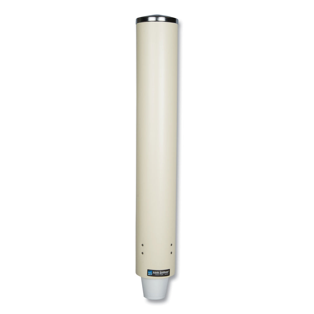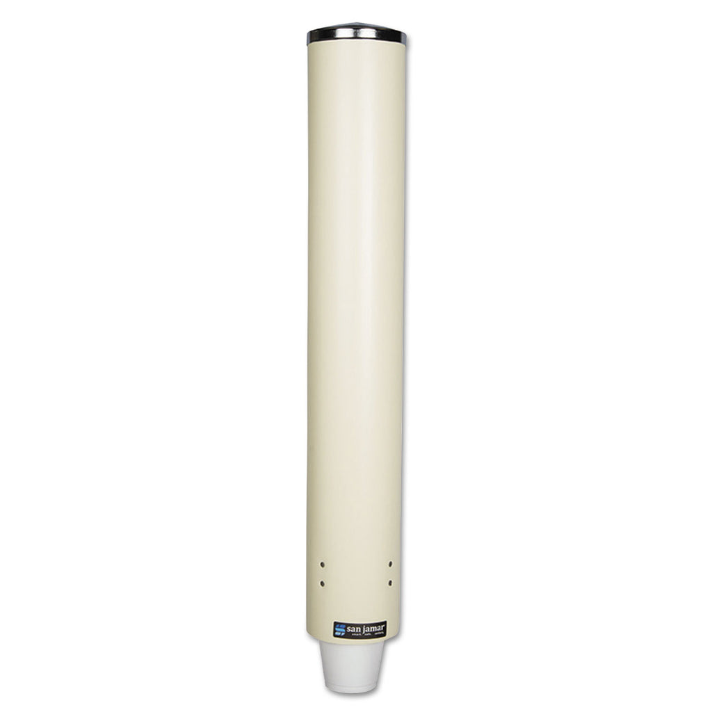 Pull-type, wall-mount style; top loading, gravity fed. Self-adjusting to eliminate cup damage. Holds 4- to 10-oz. cups.