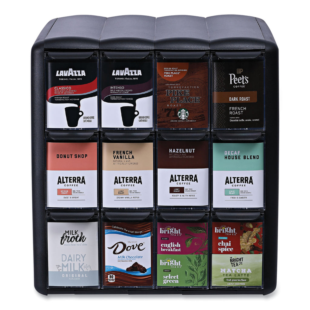 Lets you organize your workplace's unique beverage preferences. It shows a variety of coffee, tea, chocolate and specialty beverages. Versatile merchandiser holds any type of Freshpacks (sold separately), and great-tasting drinks can help you make more of any workday. Horizontal modular design makes efficient use of counter space. Each drawer holds up to 40 drinks.