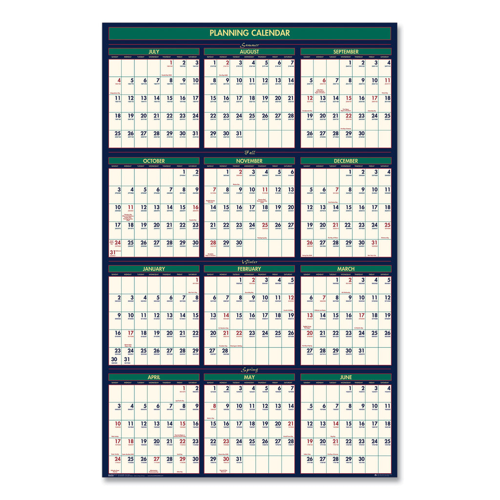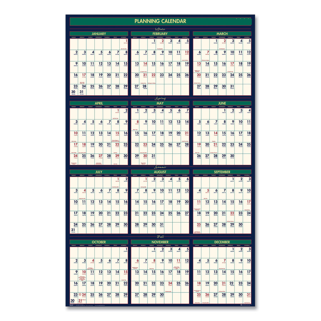 Heavy-laminated surface wipes clean with a damp cloth. Includes black, water-soluble marker and hanging tabs for easy wall-placement. Vertical-format design; one side arranged in business quarters, the other in academic/fiscal quarters. Holidays printed in red. Calendar is printed on 100% recycled paper.