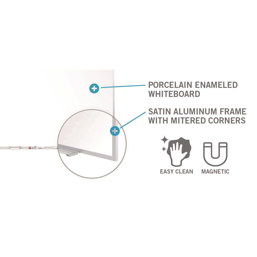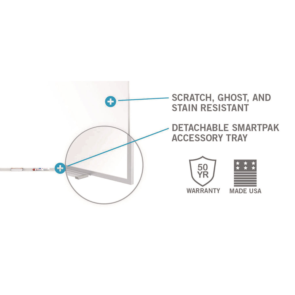 Designed with communication, collaboration and learning in mind, 28-gauge porcelain-on-steel surface is mounted to a strong, three-eighth inch thick backing to deliver superior, scratch-, dent- and stain-resistant performance. Ideal for high-traffic environments, particularly schools and offices, the durable porcelain surface also erases easily, without ghosting. Worry-free packaginglarge-format surface comes in two pieces with an included joiner strip.