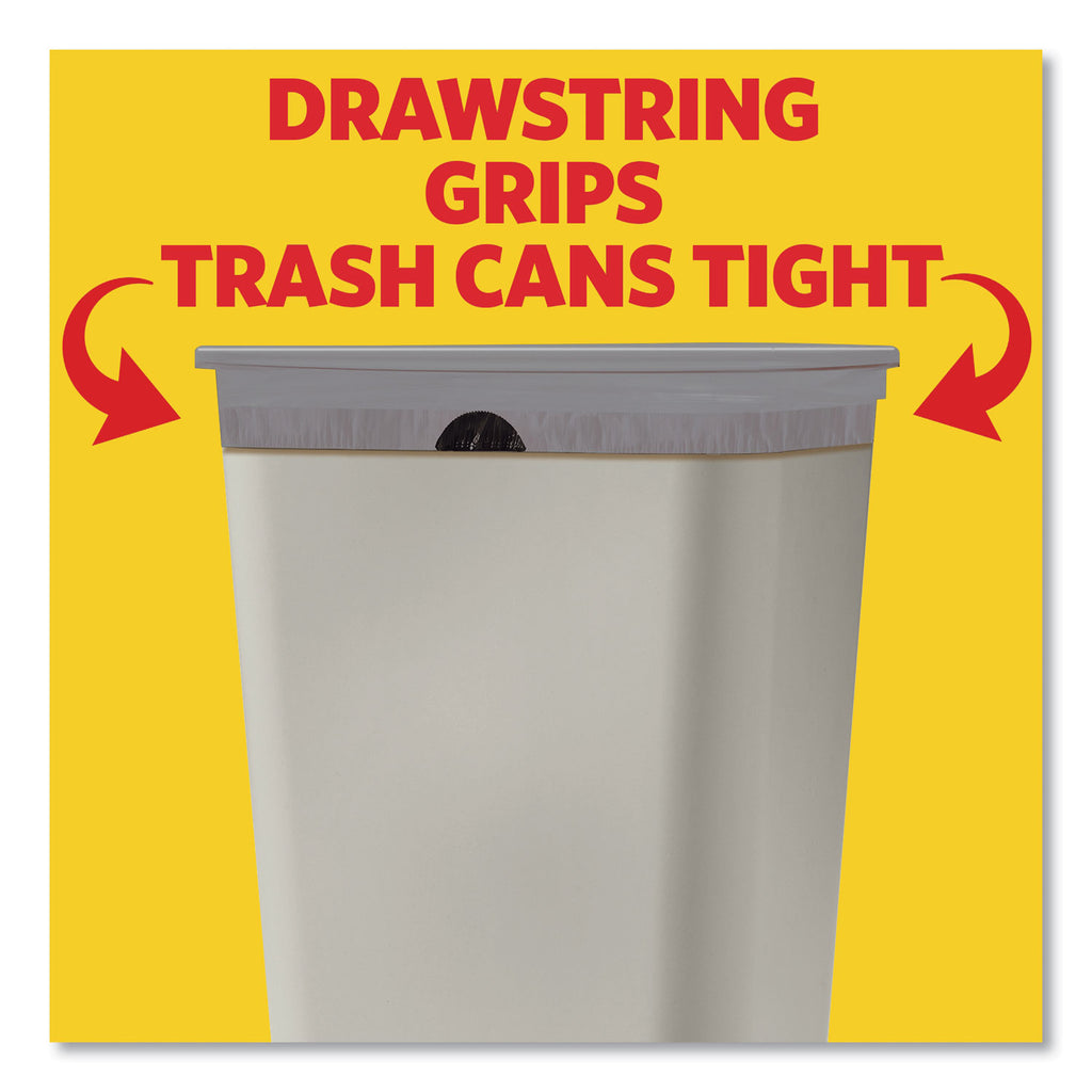 Unscented and provide strength plus odor control, to keep your kitchen or breakroom fresh and clean. These kitchen garbage bags are made with OdorShield® technology for guaranteed 5-day odor control, based on lab test. Trash can liners are double layered to trap, lock and neutralize odors. The unique checkerboard outer layer of the garbage bag is equipped with LeakGuard™ for added leak protection, while the inner layer stretches and provides reinforce strength to prevents rips and tears. With the 3-ply drawstring, which grips the can, the bag stays in place until you are ready to take it out. The drawstring bag makes closing and carrying easy. These odor-eliminating, trash bags, fit tall kitchen trash cans, and are perfect for use in kitchens.