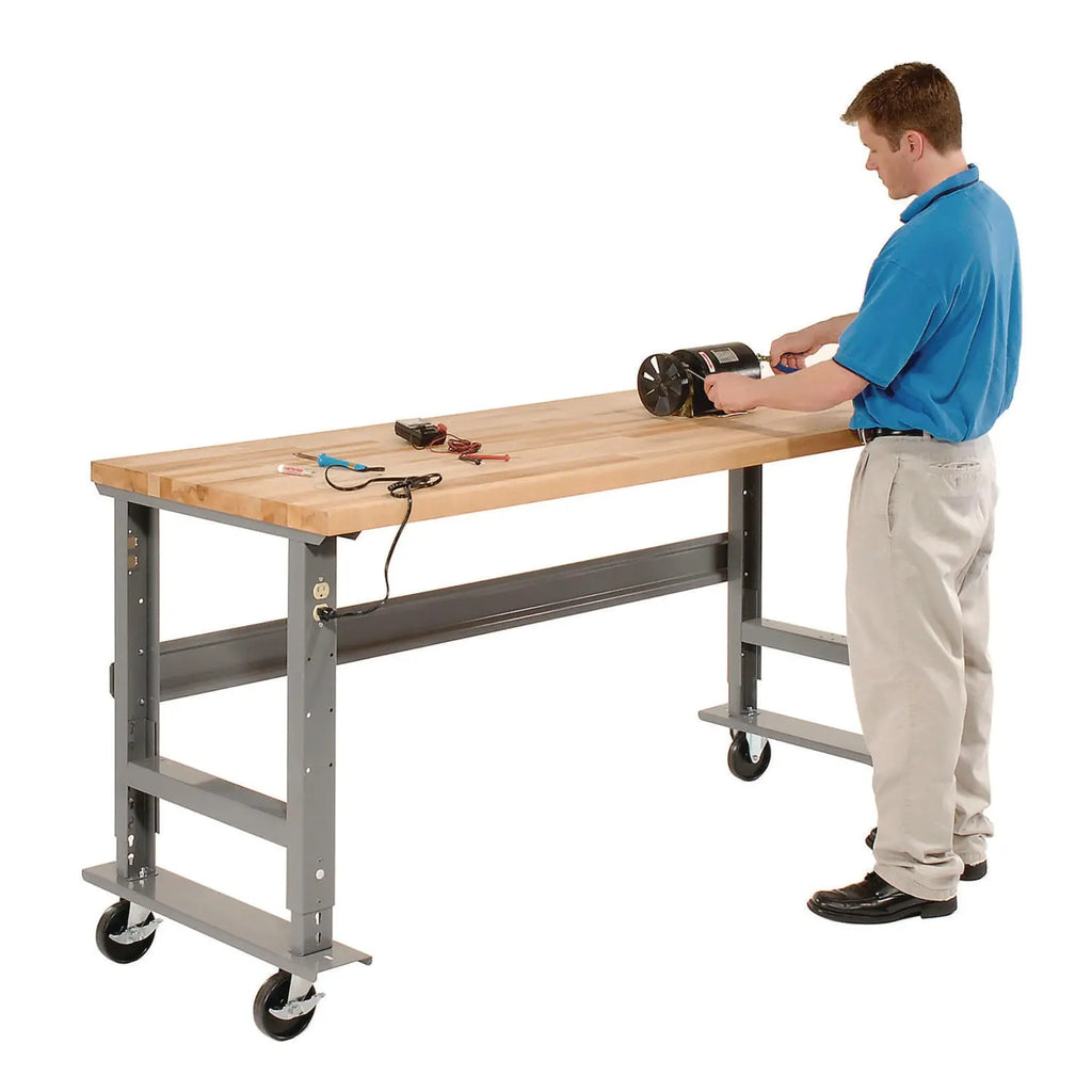 This workbench creates a versatile and adaptable industrial workspace. With a smooth, non-conductive work surface and a C-Channel leg design, this adjustable height workbench provides durability and stability to withstand daily use in various applications. Featuring removable duplex knockouts, you can install outlets to create a powered workbench.