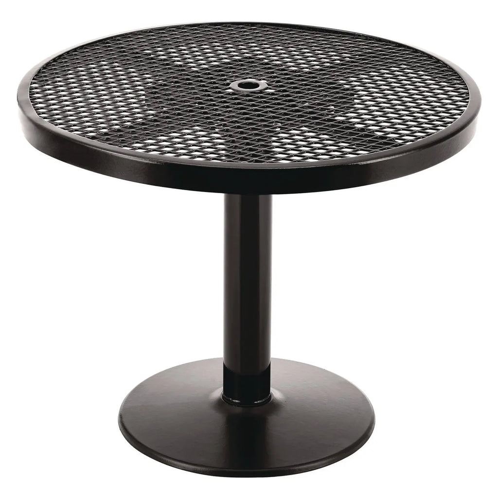 Provide unique style and comfortable outdoor dining for guests with this outdoor dining set. Ideal for restaurants, bars, outdoor food courts, public parks and streateries! Thermoplastic coating resists fading, mold and vandalism. High-gloss surface is designed to stay cool under the hot sun. 36" tabletop includes an opening to accept an umbrella with a pole of up to 1.5" diameter. The sturdy pedestal base features a black textured powder coat finish that resists corrosion. This table and chair set is easy to clean and will ensure maintenance-free durability through years of high-traffic usage. Easy assembly.