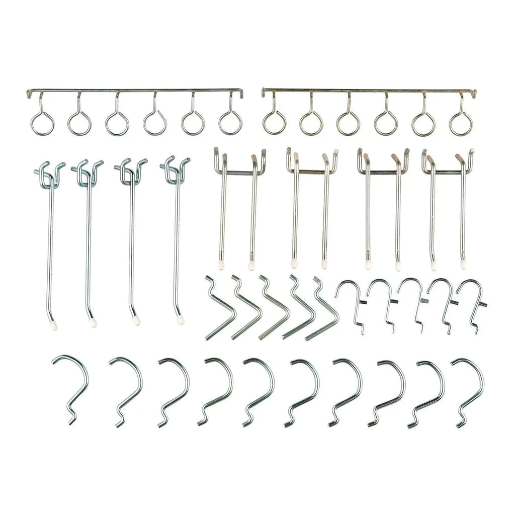 - Set includes two tool rail hooks, four single-hook peg hooks, five slant hooks, four double-hook peg hooks, five small curved hooks, and 10 curved hooks.
