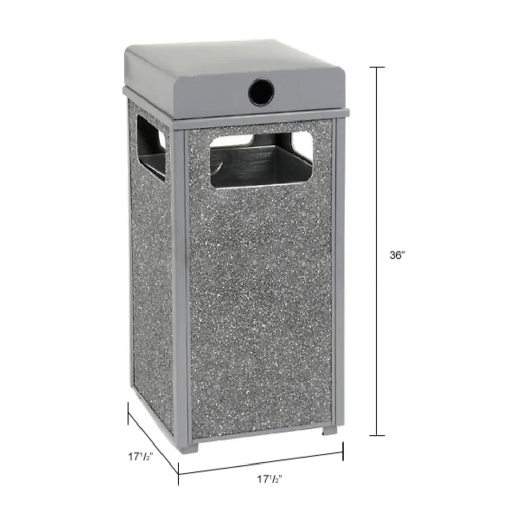 This trash receptable urn withstands extreme weather conditions and long-term daily use with a fire-safe and attractive stone finish. The stone panels are made out of reinforced resin material that is maintenance and vandalism free. Top removes easily for emptying. Includes leak-proof, fire resistant removable galvanized steel liner with handles. Heavy steel frame construction provides stability. Includes fixed height feet for anchoring. Removable Sand Urn top for easy cigarette butt disposal. Ships assembled.
