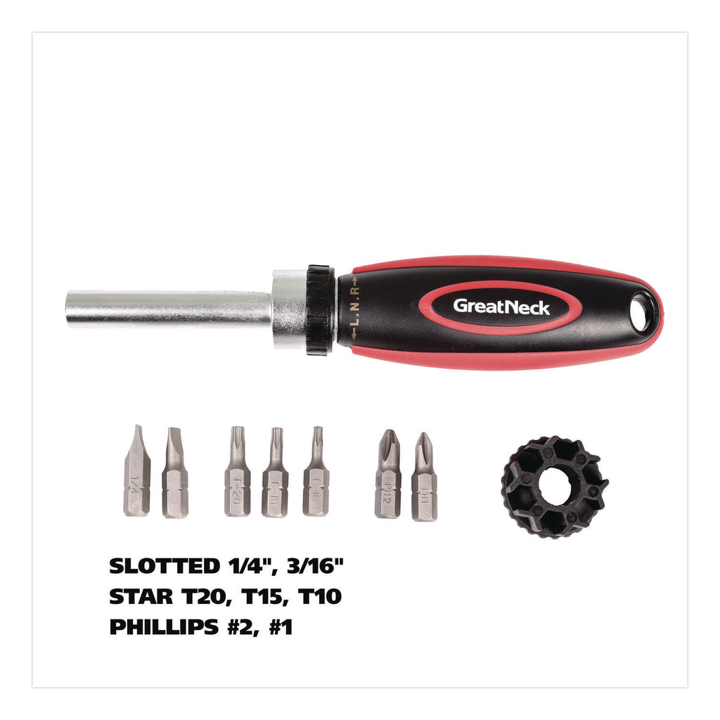 Reversible driver features a three-position selector ring for clockwise and counterclockwise ratcheting as well as a center lock for standard screw and nut driver performance. Includes precision-ground sandblasted steel bits, precision-machined chrome-vanadium-plated steel sockets as well as handy bit and socket organizers.