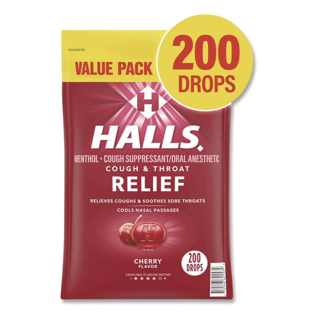 Halls Relief Cough Drops are ready for whatever life throws, or coughs, your way. With 5.8 mg of menthol per drop, these Halls cough drops relieve coughs, soothe sore throats and cool nasal passages to relieve your worst symptoms. This value size pack of cough suppressant drops come in a tasty flavor that is both refreshing and soothing. Whether you're using Halls cough drops for sore throat relief, cough relief or as an oral anesthetic, simply dissolve one drop in your mouth slowly, and repeat every two hours as needed. Once the drop starts to dissolve, it usually starts working quickly. The advanced formula and triple soothing action get you back on your feet so that you can do the things you need to do. Halls Relief menthol cough drops are formulated for adults and children five years and older. Each bag contains 200 menthol cough drops, giving you enough to stock your home or office during cold and flu season. The bags are resealable to keep the cough drops fresh and effective. The resealable packaging also makes it easy to toss into your bag, travel pack or desk drawer, giving you convenient access when symptoms strike.