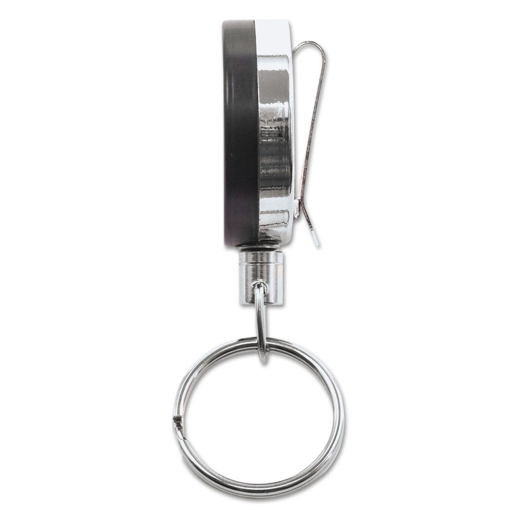 Retractable cord allows convenient scanning/swiping of cards. Instant access to badges, cards or keys. Steel link chain and nickel-plated steel split key ring.