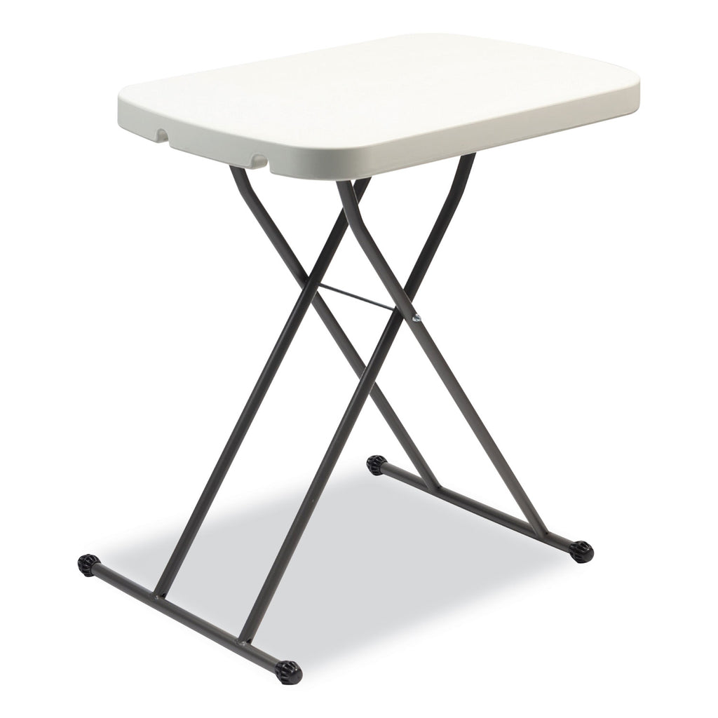Lightweight, durable, compact and infinitely portable, this folding table is ideal for personal use, but it can also seat two in a pinch. Easy to clean, high-density polyethene tabletop is dent- and scratch-resistant. Sturdy and stable, X-style metal base is height-adjustable to accommodate nearly anyone, sitting or standing.