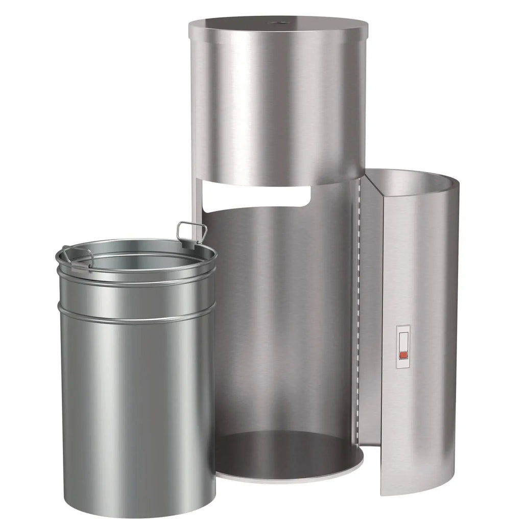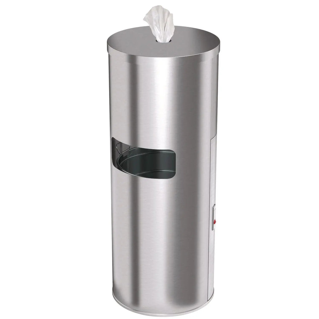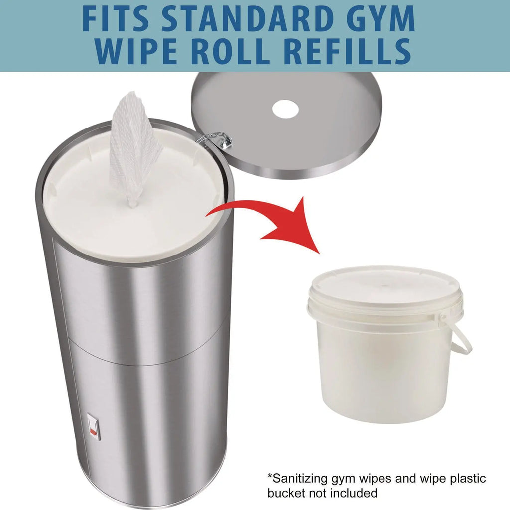 Enhance your facility with our stainless steel trash can featuring a built-in sanitizer gym wipe dispenser. This versatile unit combines a trash can with a wipe dispenser, making it ideal for high-traffic environments. The removable inner bucket with a locking door ensures secure waste management, while the dispenser accommodates all sizes of gym wipe refills. A security chain keeps the dispenser lid attached for added convenience. With its durable stainless steel construction and slim, space-saving design, this trash can is perfect for exercise facilities, hospitality, medical, multi-family residential, and retail environments.