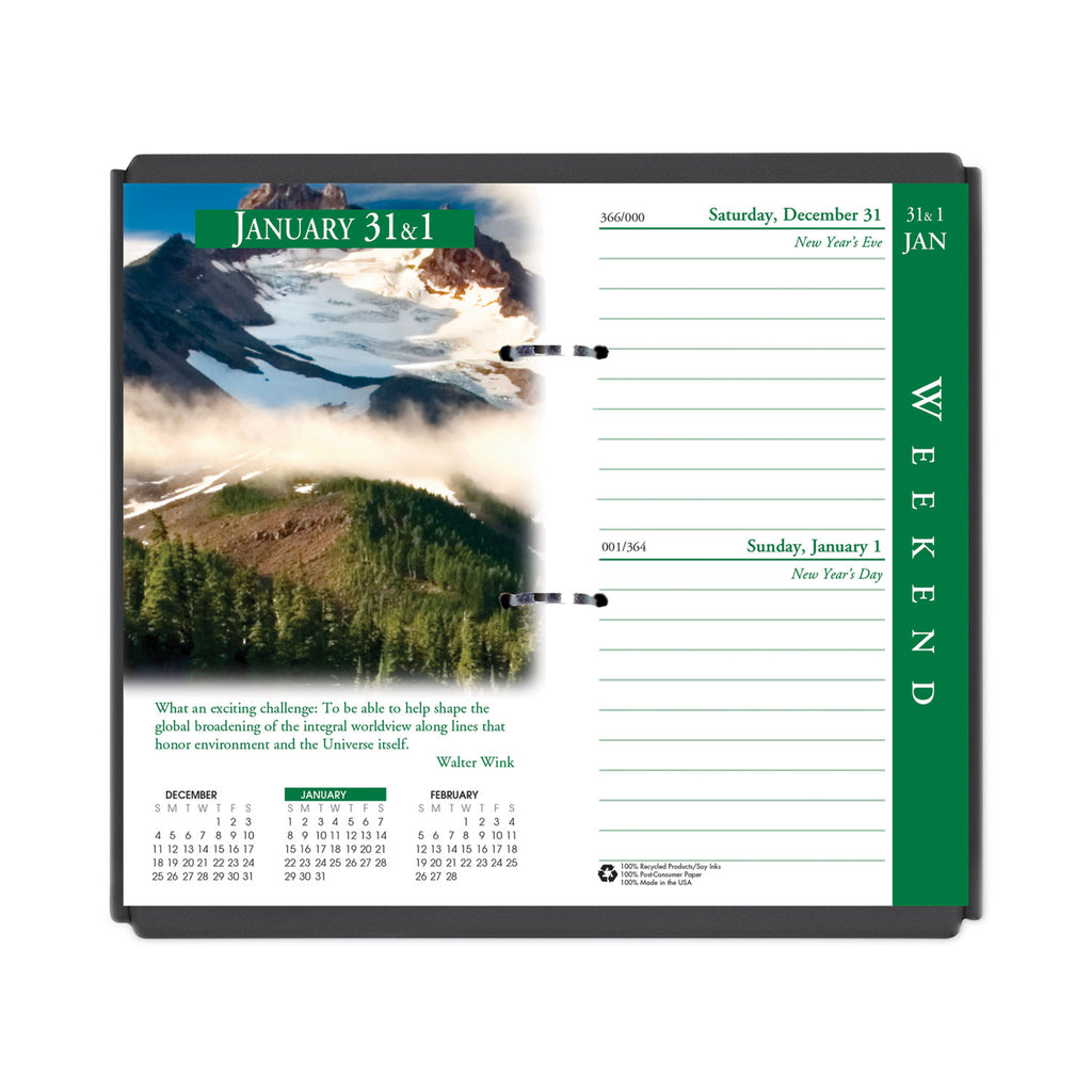 Full-color nature photography combined with inspirational quotes. Three-month reference calendar. Includes Julian dates and days remaining. Color-coded page edge speeds date search. Fits standard base. Made entirely of recycled materials.