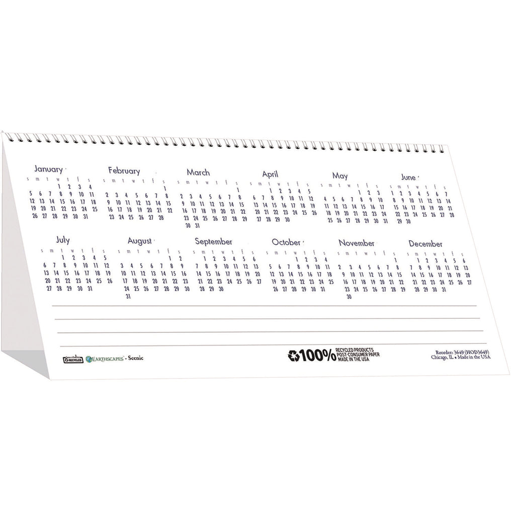 Beautiful, full-color scenic landscapes on each month. Made entirely of recycled materials.