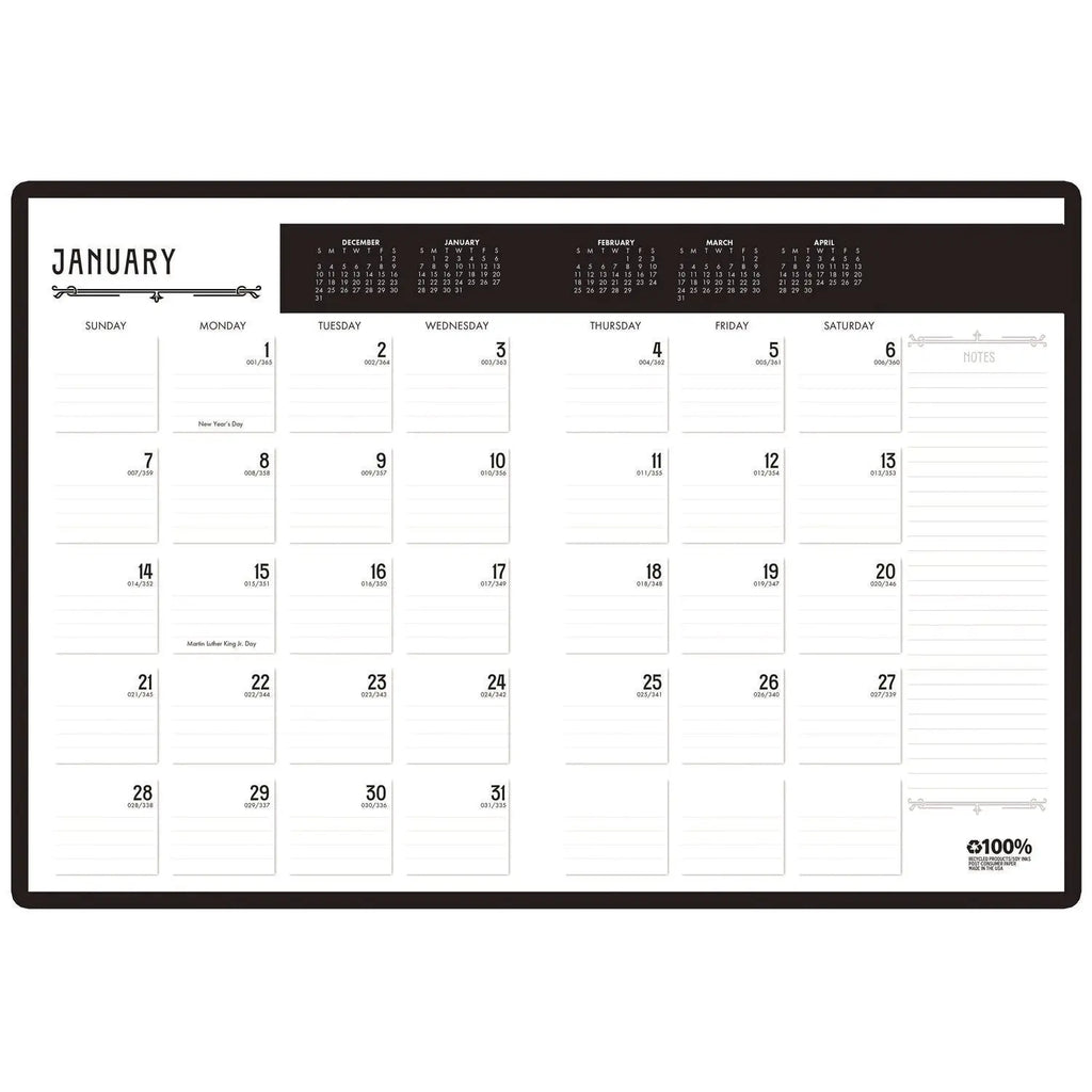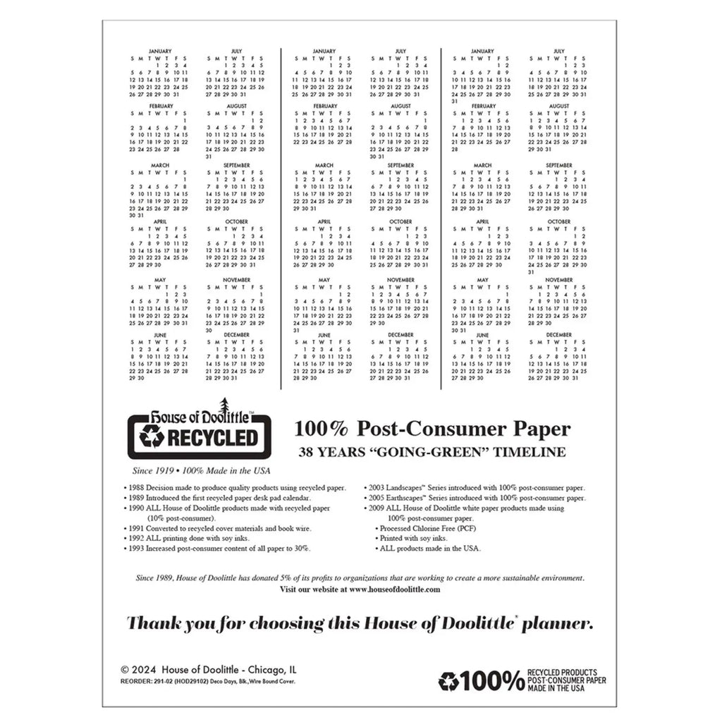 Enjoy the 1920's art deco period with this monthly planner. This recycled monthly planner features an art deco design on each monthly layout. It is gold wire bound with a black embossed leatherette cover to withstand the daily use throughout the year. Lightly ruled daily blocks keep notations neat. Includes a three-year reference calendar page and a three-year holiday page.